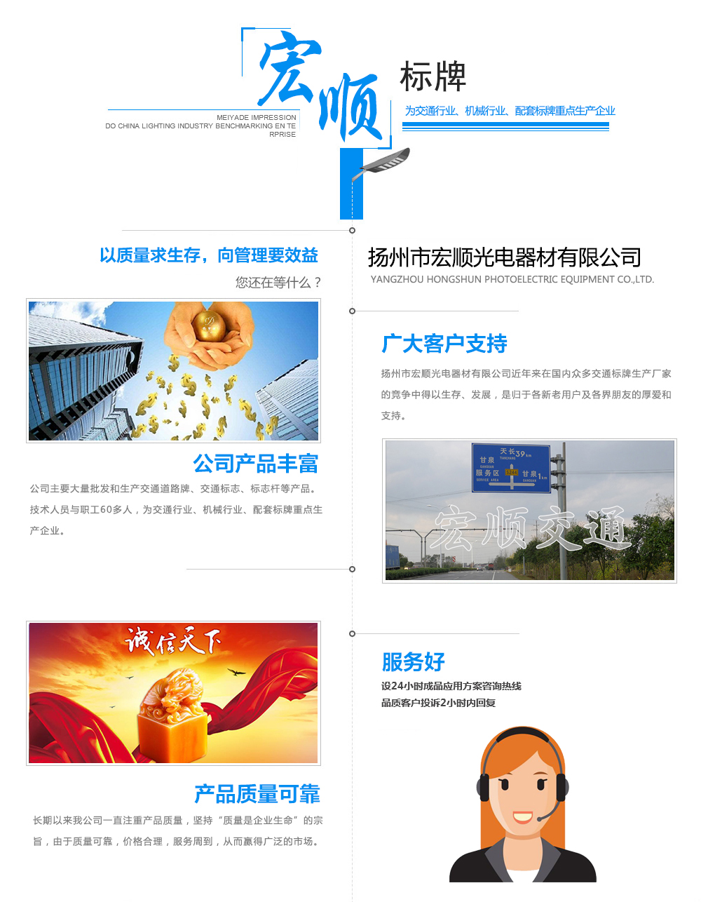 揚(yáng)州市宏順光電器材有限公司近年來在國內(nèi)眾多交通標(biāo)牌生產(chǎn)廠家的競爭中得以生存、發(fā)展,是歸于各新老用戶及各界朋友的厚愛和支持。我們?nèi)w員工向你們致以誠摯的感謝。 為使我們共同步入新世紀(jì),提高我們的產(chǎn)品質(zhì)量與服務(wù)希望對我們提出寶貴的意見,使我們不斷改進(jìn)、創(chuàng)新。 我們將和過去一樣,視今天的質(zhì)量為明天的市場。為您奉獻(xiàn)滿意的各種精品,為美化我們的交通事業(yè)做出貢獻(xiàn)。 公司主要大量批發(fā)和生產(chǎn)道路交通標(biāo)志牌、道路指示牌、交通標(biāo)志牌、指路牌、反光標(biāo)志牌等產(chǎn)品。技術(shù)人員與職工60多人,為交通行業(yè)、機(jī)械行業(yè)、配套標(biāo)牌重點(diǎn)生產(chǎn)企業(yè)。 長期以來我公司一直注重產(chǎn)品質(zhì)量,堅(jiān)持“質(zhì)量是企業(yè)生命”的宗旨,由于質(zhì)量可靠,價(jià)格合理,服務(wù)周到,從而贏得廣泛的市場,近年來隨著交通事業(yè)的開發(fā)和研究,傾聽用戶的意見,使得我們在市場競爭中不斷發(fā)展壯大。 我們本著“質(zhì)量可靠、信譽(yù)優(yōu)先、用戶至上”的宗旨,“以質(zhì)量求生存,向管理要效益”的信條,竭誠為... ...【查看更多】